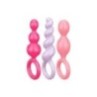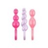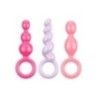 Set di 3 plug anali con impugnatura ad anello in silicone di 3 diversi colori (rosso, rosa e viola) lunghi rispettivamente 13,5, 13,5 e 14 centimetri e con un diametro di 3 centimetri. Privi di ftalati.