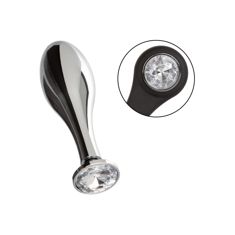 Informazioni aggiuntive : Potenziatore in silicone elastico e resistente con sonda metallica a goccia liscia e senza giunture, Design multifunzionale per un sostegno e un potenziamento personalizzato, Il plug e l'enhancer in metallo si smontano per una facile pulizia, Il metallo trattiene il calore o il freddo per giocare con la temperatura, Accento di gemme scintillanti, Non si appanna e non contiene nichel.