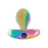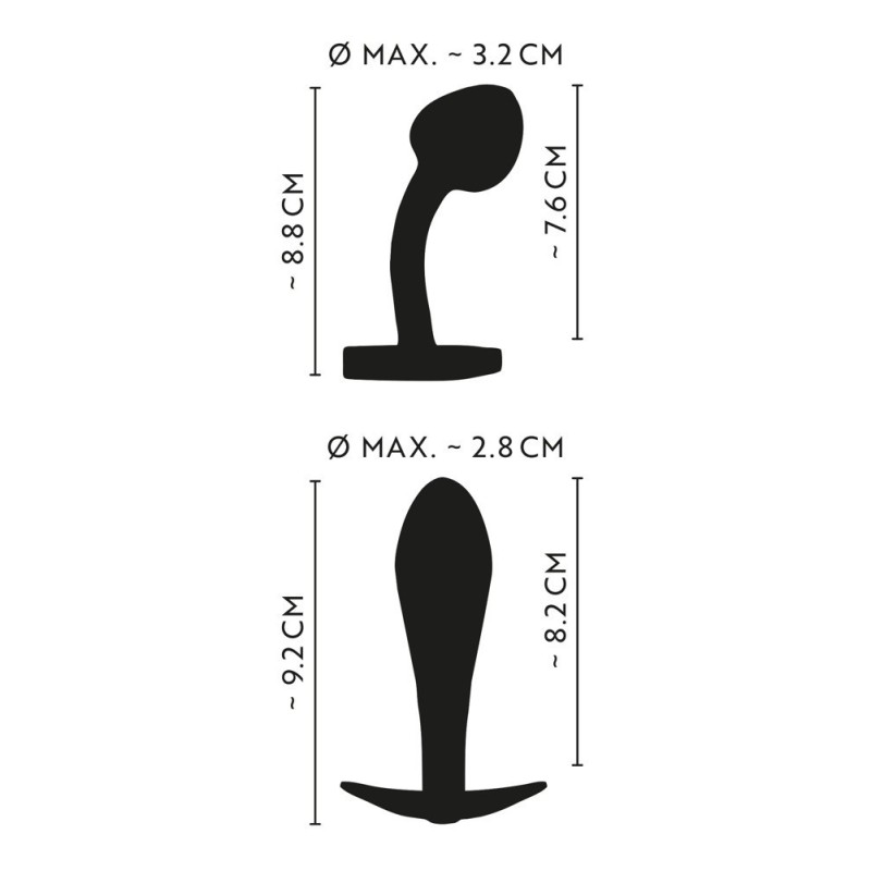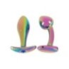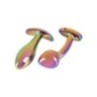 Due arcobaleni per la felicità anale! Metal Butt Plug Set in Rainbow Colors di ANOS con 2 plug anali di metallo in scintillanti colori arcobaleno. Uno ha una classica forma conica, l'altro è leggermente curvo con una punta a forma di punto P. Entrambi sono lisci e senza cuciture e hanno un ampio ancoraggio/stop per una manipolazione sicura senza scivolare. Questo rende possibile indossare i tappi di metallo piacevolmente pesanti per periodi di tempo più lunghi. La classica spina dritta è inoltre decorata con una pietra preziosa blu nell'ancora. Le spine di metallo sono anche perfette per il gioco della temperatura: Basta metterli in frigo a raffreddare o in un bagno d'acqua per riscaldarli. Spina dritta: lunghezza totale 9,2 cm, lunghezza d'inserimento 8,2 cm, Ø max. 2,8 cm. Peso 81 g. Spina curva: lunghezza totale 8,8 cm, lunghezza d'inserimento 7,6 cm, Ø max. 3,2 cm. Peso 75 g. Metallo, acrilico.