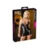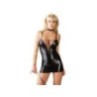 Abbigliamento donna per serate erotiche e Club. Sexy mini abito colore nero con tessuto effetto bagnato. Modello corto, aderente a bretelline con scollatura ad intreccio di stringhe che lasciano intravedere la parte centrale del seno.