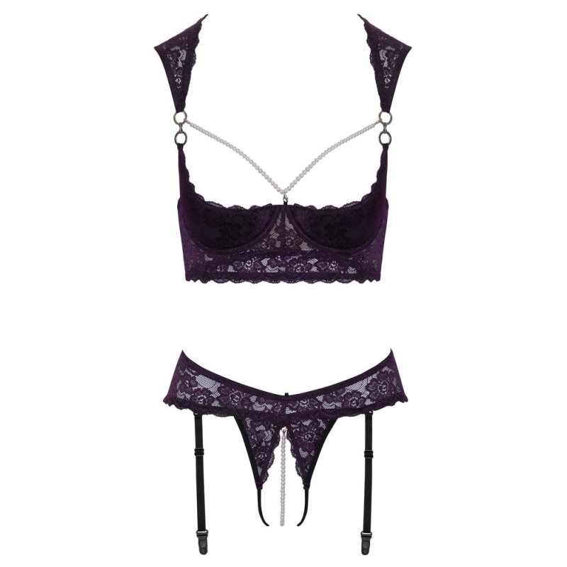 Sollevatore lungo e reggicalze riostring ouvert combinati nel set di Cottelli LINGERIE. Realizzato in pizzo viola scuro con dettagli neri, decorato con anelli argentati e perline bianche. Il ferretto con coppe leggermente imbottite mette il seno in perfetta forma e direttamente in vista. La collana di perle che incornicia il seno è removibile grazie ai suoi piccoli moschettoni. Raffinata soluzione di spalline con laccio sulle spalle, piccola chiusura al collo. Le spalline e la chiusura con gancio sono regolabili nella parte posteriore. Il Garter Rio seduce con una stimolante collana di perle sul cavallo aperto, che è rimovibile, proprio come le 6 bretelle regolabili.