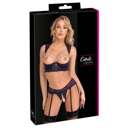 Sollevatore lungo e reggicalze riostring ouvert combinati nel set di Cottelli LINGERIE. Realizzato in pizzo viola scuro con dettagli neri, decorato con anelli argentati e perline bianche. Il ferretto con coppe leggermente imbottite mette il seno in perfetta forma e direttamente in vista. La collana di perle che incornicia il seno è removibile grazie ai suoi piccoli moschettoni. Raffinata soluzione di spalline con laccio sulle spalle, piccola chiusura al collo. Le spalline e la chiusura con gancio sono regolabili nella parte posteriore. Il Garter Rio seduce con una stimolante collana di perle sul cavallo aperto, che è rimovibile, proprio come le 6 bretelle regolabili.