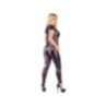 Tuta nera a maniche corte dal taglio aderente. Aspetto opaco emozionante con inserti sapientemente posizionati in rete elettrica trasparente. 4 cinturini con fibbia su ogni lato nella zona della vita. Con una cerniera a 2 vie dalla profonda scollatura