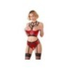 Sensuale bustier in raso con gancio leggermente imbottito e dettagli con spalline regolabili incluso colletto regolabile. Con inserti in pizzo semitrasparente e allacciatura decorativa sul busto. Un anello di strass nella parte anteriore della cintura completa l'aspetto. Lo slip abbinato, senza cavallo, ha un taglio in vita e bretelle regolabili e rimovibili. Ai fianchi è trattenuto da 3 elastici. Con un altro anello di strass in vita e inserti in pizzo semitrasparente sul davanti e sul retro.