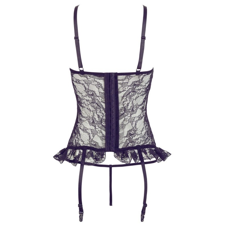 Corpetto in pizzo con coppe con ferretto, scollo a V profondo e volant in pizzo sull'orlo. Chiusura con gancio sul retro. Cinghie e 4 bretelle regolabili. Inclusa stringa corrispondente. Nero. 90% poliammide, 10% elastan. Senza calze.