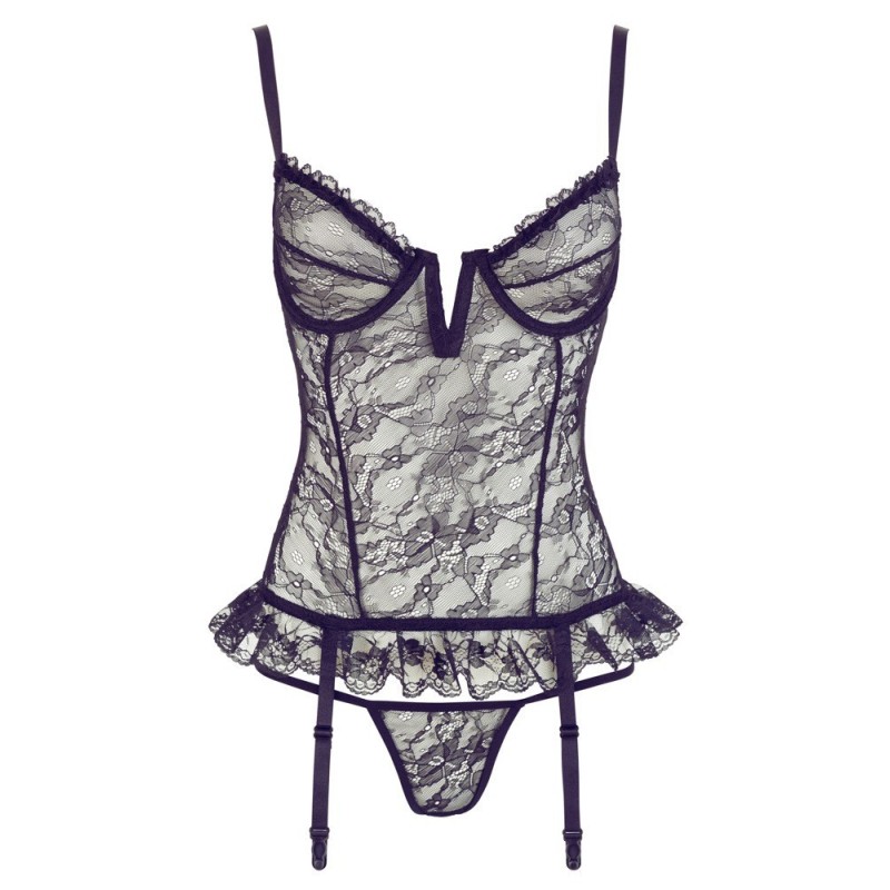 Corpetto in pizzo con coppe con ferretto, scollo a V profondo e volant in pizzo sull'orlo. Chiusura con gancio sul retro. Cinghie e 4 bretelle regolabili. Inclusa stringa corrispondente. Nero. 90% poliammide, 10% elastan. Senza calze.