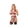 Set di bretelle in 3 pezzi con bretelle allacciate con chiusura a clip, cintura per bretelle con chiusura a gancetto sul retro e bretelle regolabili, nonché una corda completamente senza cavallo. Realizzato in Powernet nero. Impreziosito da ricami glitter rossi dalla scollatura al cavallo. Con una parte anteriore continuamente aperta, collegata da 5 elementi di strass.