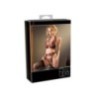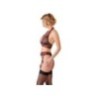 Set di bretelle in 3 pezzi con bretelle allacciate con chiusura a clip, cintura per bretelle con chiusura a gancetto sul retro e bretelle regolabili, nonché una corda completamente senza cavallo. Realizzato in Powernet nero. Impreziosito da ricami glitter rossi dalla scollatura al cavallo. Con una parte anteriore continuamente aperta, collegata da 5 elementi di strass.