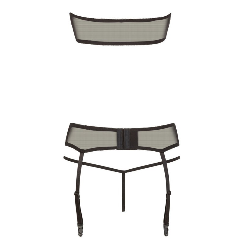 Set di bretelle in 3 pezzi con bretelle allacciate con chiusura a clip, cintura per bretelle con chiusura a gancetto sul retro e bretelle regolabili, nonché una corda completamente senza cavallo. Realizzato in Powernet nero. Impreziosito da ricami glitter rossi dalla scollatura al cavallo. Con una parte anteriore continuamente aperta, collegata da 5 elementi di strass.