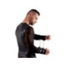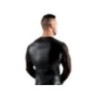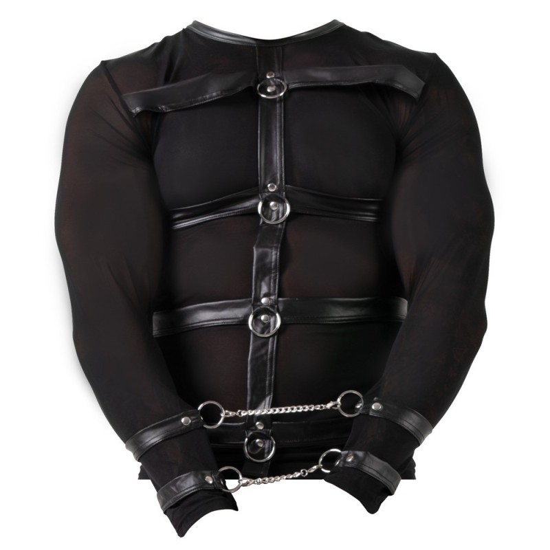 Camicia a maniche lunghe in powernet elastico e morbido con imbracatura cucita e anellata sul davanti. Torna completamente nel look opaco di tendenza. Lunghe maniche in powernet all'estremità con cinghie bondage cucite dall'aspetto opaco, che sono dotate di anelli, nei quali può essere agganciata una breve catena di collegamento con i moschettoni.