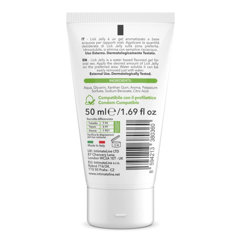 Lick Jelly, Mela Verde è una emulsione in gel dall’aroma goloso e sensuale, che abbina l’azione idratante e addolcente dello zucchero a quella rigenerante degli estratti naturali dei frutti. Gustoso e raffinato si rende particolarmente ideale ove si gradiscono sapori intimamente alternativi.