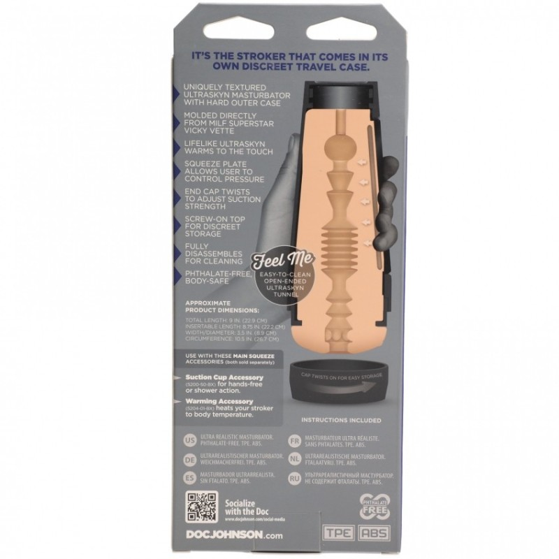 "Lei è sempre a portata di mano. La linea di masturbatori Main Squeeze di Doc Johnson, con gli stampi delle nostre pornostar più famose, è stata progettata per mettere il potere nelle vostre mani, con un'impugnatura comprimibile che vi permette di variare la forza di ogni colpo e un cappuccio terminale che regola l'aspirazione. Modellato direttamente dal corpo della superstar MILF Vicky Vette, questo stroker ULTRASKYN ha l'aspetto e la sensazione di spingere nella sua figa perfetta.