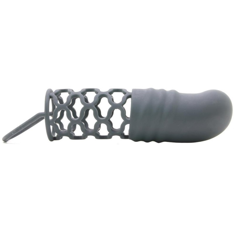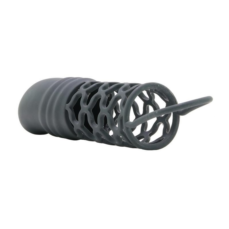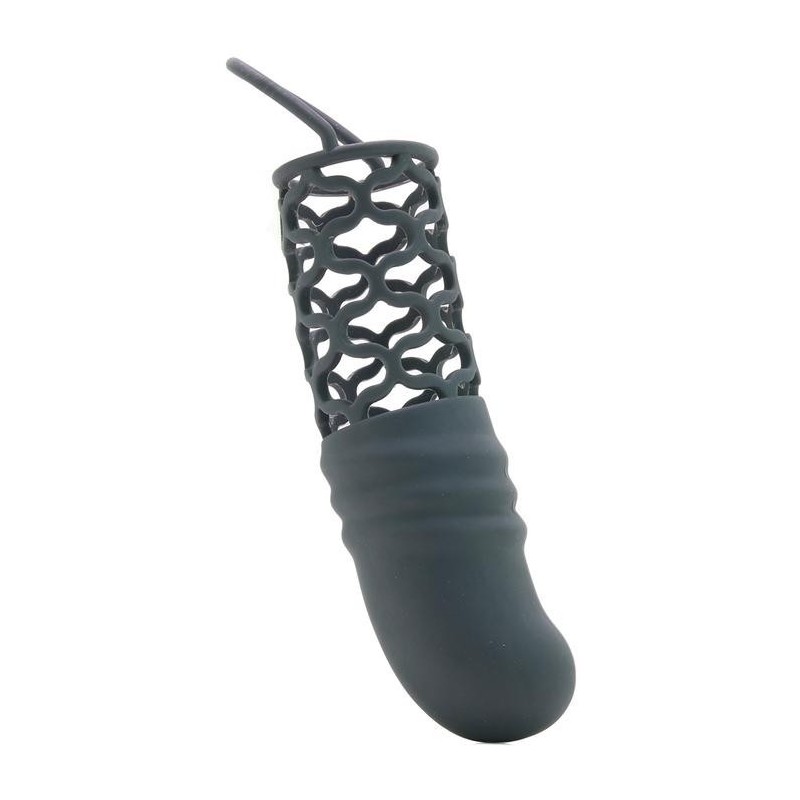 guaina fallica indossabile in silicone nero con anello fallico per testicoli .