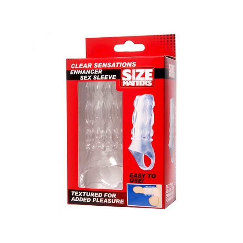 Clear Sensations Enhancer Sex Sleeve è una guaina capace di aumentare le dimensioni del vostro pene e le prestazioni, tutto in uno. Provate questa fantastica guaina per migliorare le vostre dimensioni, una guaina per pene strutturata e sottile, perfetta per l'uomo dinamico. Come funziona? basta farla scivolare sul vostro pene per avere un miglioramento nell'erezione istantaneo, senza attese prolungate, pillole o creme! Inoltre dei rilievi esterni stimolano il vostro partner ogni volta che lo penetrate. La guaina presenta un design trasparente e aperto nella parte finale, molto confortevole. Una volta inserito lo scroto all'interno del cinturino potrete facilmente divertirvi in completa sicurezza, la guaina rimarrà saldamente ferma in posizione. Incrementate il vostro potenziale con Size Matters. Potrete estendere la resa della vostra performance sessuale con una linea di prodotti che renderanno tutto più grande e migliore! Size Matters propone una selezione di prodotti per le zone erogene per quanti siamo interessati al potenziamento. Scoprite nuove vette di piacere, con l?aumento sensibile della vostre dimensioni. Con Size Matters potrete spingere il vostro desiderio oltre i confini e i limiti della vostra fisicità!
