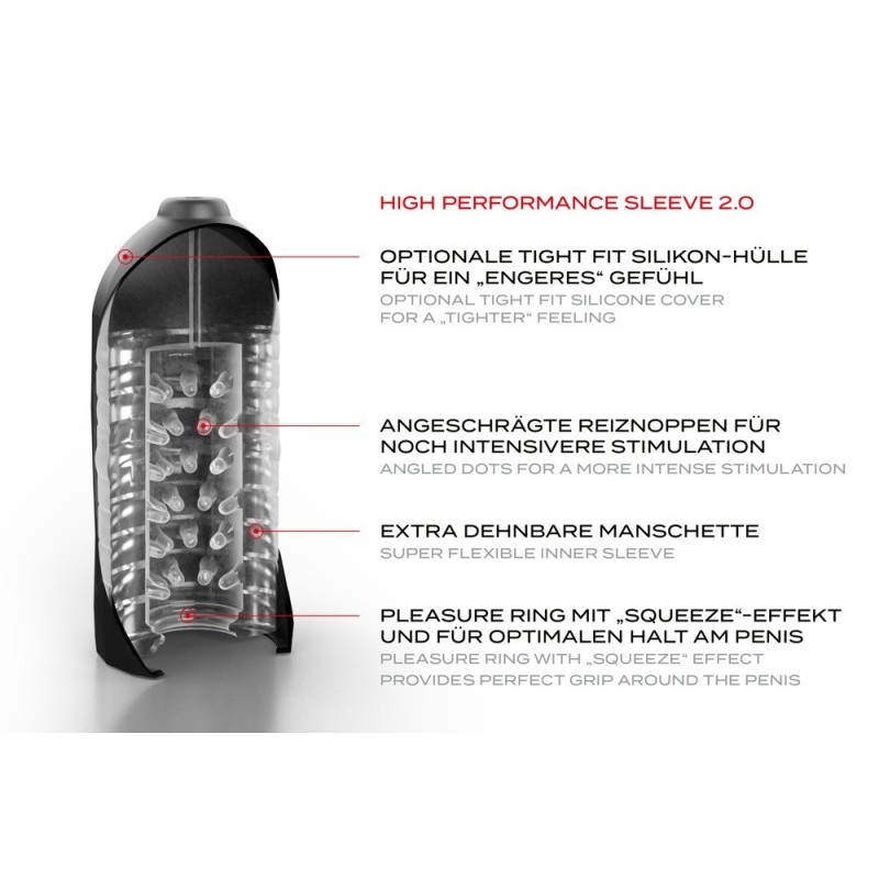 Il manicotto è stato ulteriormente ottimizzato anche per il Suck-O-Mat 2.0: ora ha delle nocche stimolanti all'interno e può essere combinato con il bracciale Tight Fit Cuff incluso per abbracciare il pene in modo ancora più stretto e quindi intensificare la stimolazione.