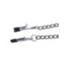 Anello per seno con catena per il collo e 4 catene con morsetti per capezzoli o intimi. Forza di pressione non regolabile. Nero/argento. Materiale: metallo . robusta Catenella realizzata in metallo di color argento ( esente da nickel ) per LEI e LUI! All'anello pettorale ( diametro 3.5 cm) e' fissato un collare e due catenele con pinzette per capezzoli ( lunghezza totale cad. 30 cm) e altre due catenelle con pinzette per vagina o altre parti intime ( lunghezza totale cad. 66 cm). Il collare e' regolabile in lunghezza grazie al moschettone.Lunghezza: 30 CM;