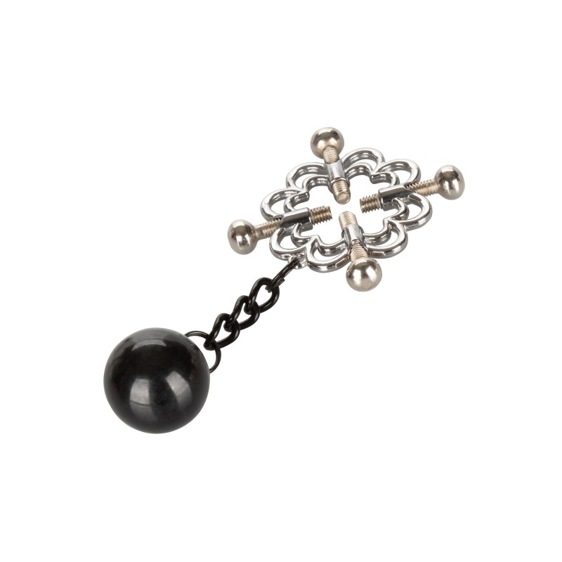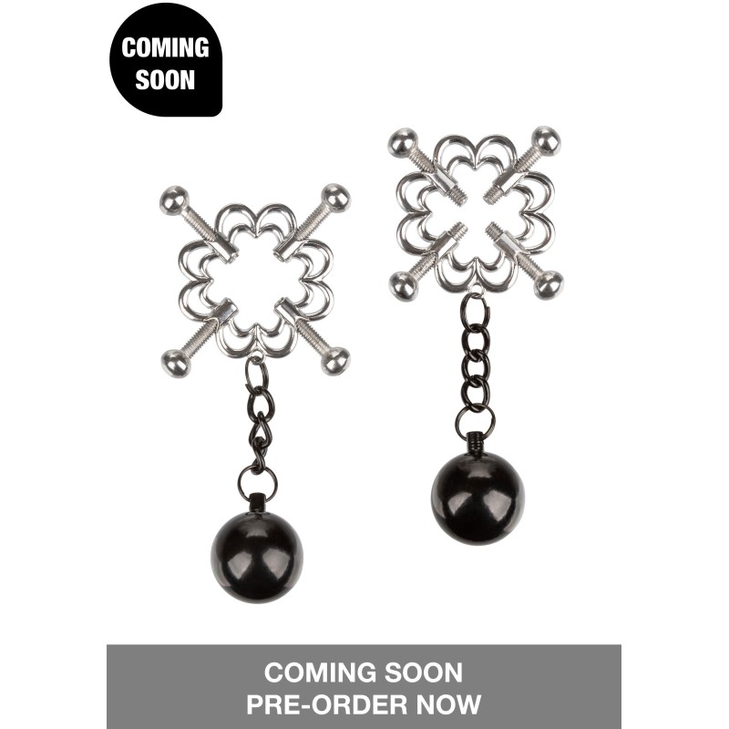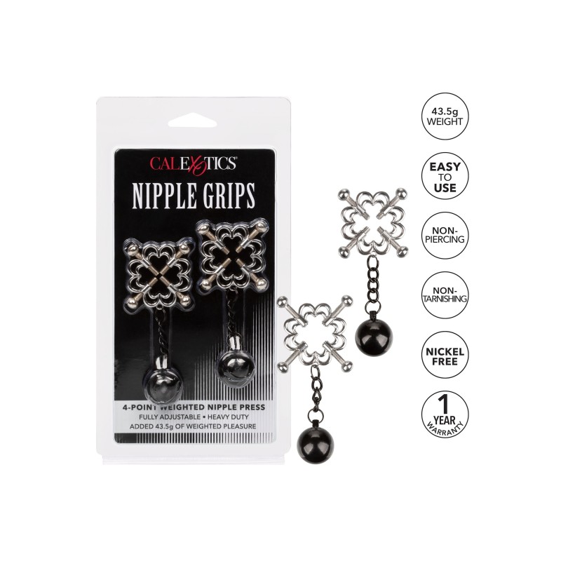 La Nipple Grips 4-Pointed Nipple Press è progettata per un gioco sensazionale con i capezzoli. Stringi le viti esattamente alla pressione che desideri, e lascia che i pesi tirino e tirino per un piacere ancora più intenso. Include 2 morsetti multiuso completamente regolabili | Pressa a 4 punti con viti completamente regolabili | Metallo resistente | Non si appanna, senza nichel | Peso aggiunto per aumentare la stimolazione