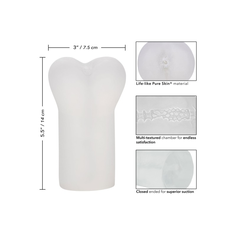 Masturbatore realistico maschile trasparente fatto con materiale realistico Pure Skin | Morbido, aderente ed elastico | Camera multi-testurizzata per una soddisfazione infinita | Estremità chiusa per un'aspirazione superiore | Igienicamente superiore e senza manutenzione