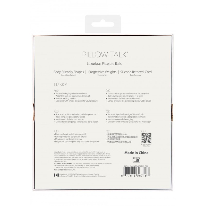 Le palline del piacere Frisky sono perfettamente ponderate per aumentare il tuo desiderio mentre rafforza i tuoi muscoli. Indossali nel tempo e nota l'eccitazione del tuo edificio. Queste squisite sfere in silicone offrono un movimento oscillante stimolante con i tuoi movimenti naturali. Frisky ha una fodera imbottita per tenerle in ordine e un elegante cavo in silicone che abbaglia con il cristallo Swarovski®. Questo è un segreto sexy che adorerai mantenere. • Finitura siliconica di alta qualità super serica • Sfere ponderate per il piacere e la forza • Movimento a dondolo interno • Progettato con sobria eleganza per il tuo piacere.