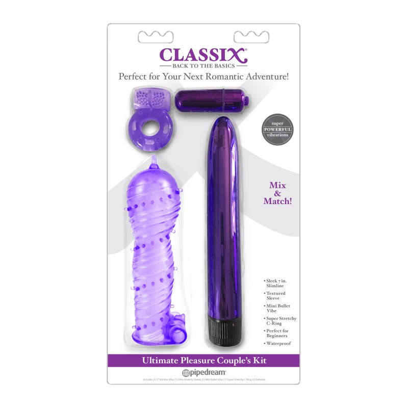 Goditi l'eccitante varietà e l'infinita versatilità con il kit di coppia definitivo! Tutti e quattro i classici preferiti possono essere usati insieme o separatamente. La sottile vibrazione a più velocità da 7" può essere accoppiata con il manicotto testurizzato ultra-stretchy e il potente proiettile per il tuo coniglio super-stimolante. Prova a mettere l'anello a C intorno alla sua asta o alle palle, con o senza il proiettile vibrante, per un eccitante gioco sessuale. Le possibilità sono infinite per ore di gioco sexy con il partner! Manicotto ultra-stretchy e C-ring7' Slimline Vibe e mini bullet potente inclusi Super stimolante