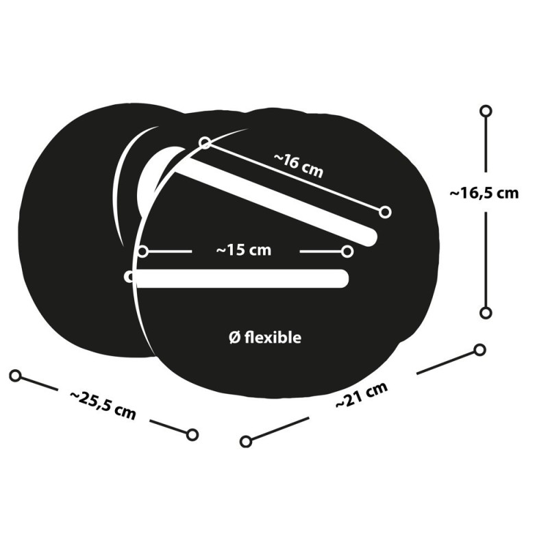 21 cm di lunghezza, 25,5 cm di larghezza, 16,5 cm di altezza. Vagina profonda 16 cm, ano profondo 15 cm, entrambi i Ø stretti ed elastici. Peso: 4.775 kg. TPE.