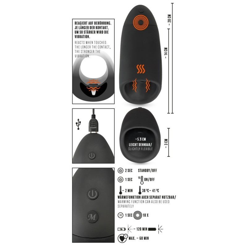 Pratico masturbatore con 3 funzioni da Rebel con scanalature di stimolazione all'interno. Ha anche una funzione di calore fino a 41°C e 10 modalità di vibrazione più una funzione Smart Shaking, che forniscono un grande cambiamento di ritmo. Tutte le funzioni possono essere controllate separatamente al tocco di un pulsante sul giocattolo. La funzione Smart Shaking reagisce al tocco e comincia a scuotere, rabbrividire e pulsare intensamente al contatto del pene! Il materiale in silicone di alta qualità fornisce una sensazione molto piacevole sulla pelle durante la masturbazione.