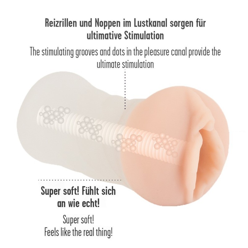 Pratico masturbatore in look vagina realistico. Il tunnel del piacere trasparente fatto di materiale simile alla pelle è dotato di nodi e scanalature di stimolazione distintamente strutturate all'interno, che forniscono un massaggio intenso ed efficace per l'orgasmo durante l'handjob. La pressione può essere facilmente variata per una deliziosa sensazione di presa. Il masturbatore è aperto sul retro - perfetto per peni più lunghi - e per una facile pulizia.
