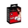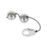 2 sfere di metallo pieno color argento pesanti e levigate su un cinturino nero con un anello di ritorno.
