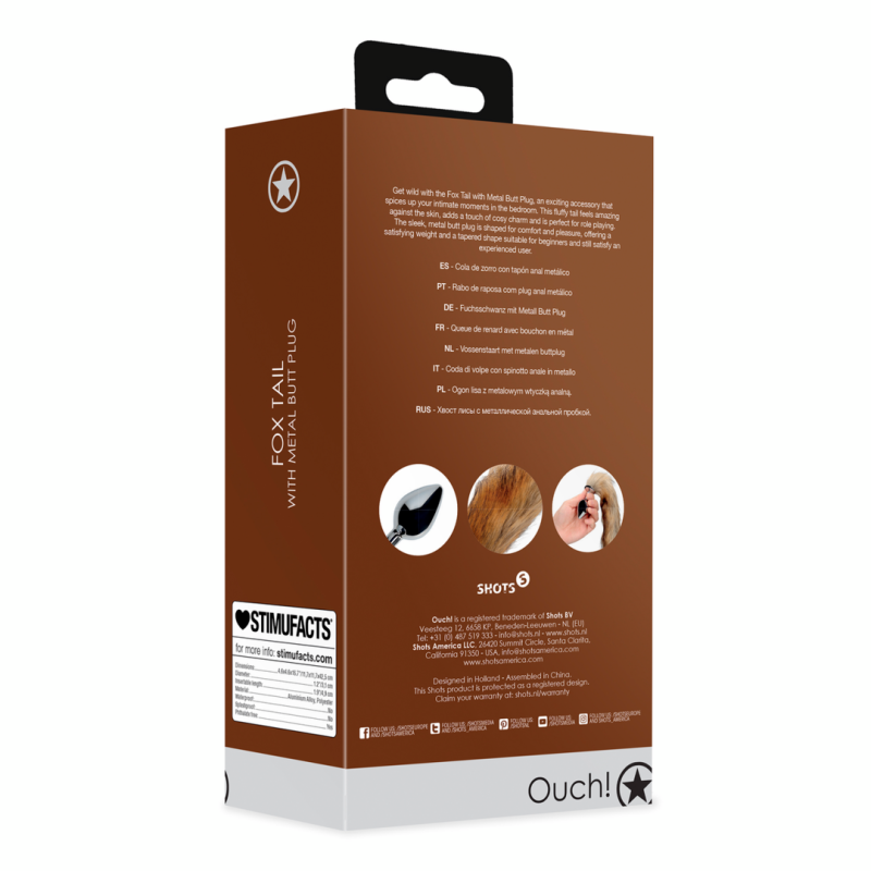 Scatenatevi con la Coda di Volpe con Butt Plug in metallo, un accessorio eccitante che vivacizza i vostri momenti di intimità in camera da letto. Questa coda soffice si sente benissimo sulla pelle, aggiunge un tocco di fascino accogliente ed è perfetta per i giochi di ruolo. L'elegante butt plug in metallo è sagomato per il comfort e il piacere, offrendo un peso soddisfacente e una forma affusolata adatta ai principianti e in grado di soddisfare anche gli utenti più esperti.