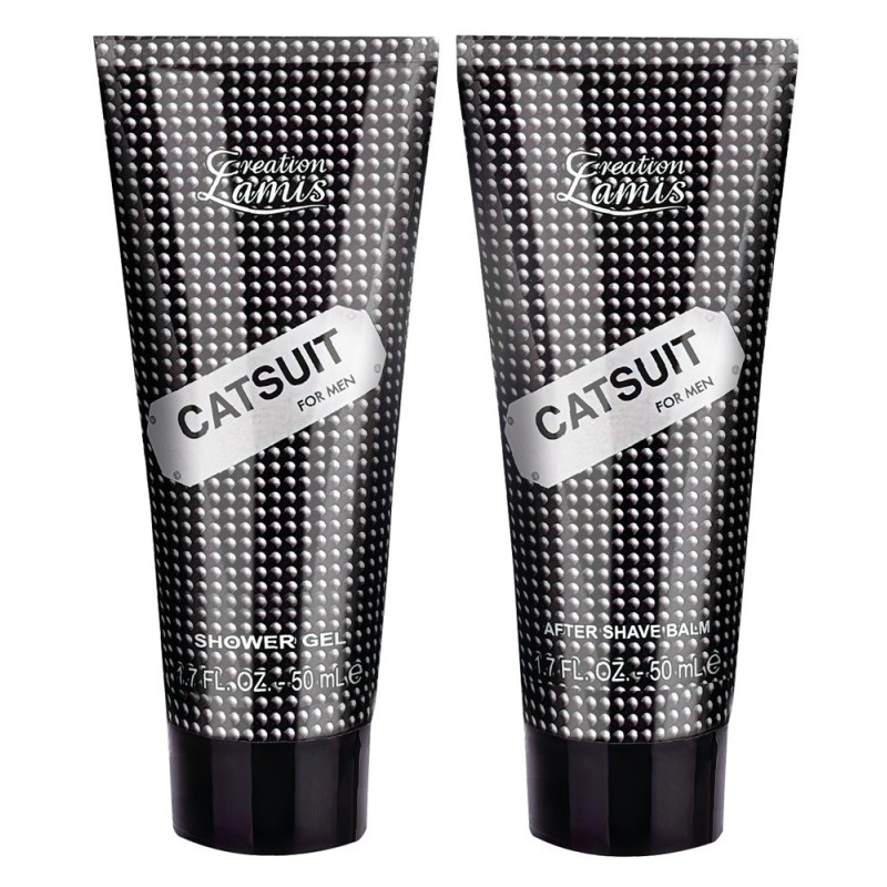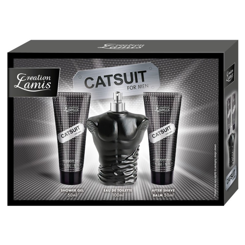 Set di 3 pezzi Catsuit for Men di Creation Lamis con Eau de Toilette (100 ml), Balsamo dopobarba (50 ml) e Gel doccia (50 ml). Con un'intensa e fresca fragranza orientale. Eau de toilette in un flacone spray di vetro dal design maschile. Balsamo dopobarba e gel doccia in tubetto. Tutti e 3 gli articoli in una scatola decorativa (regalo).