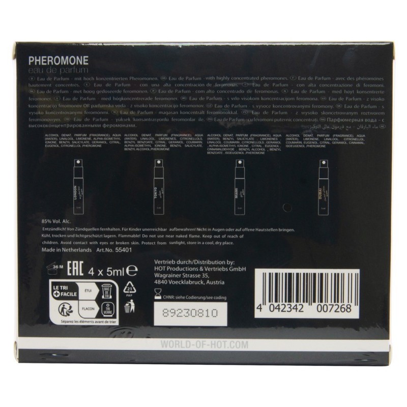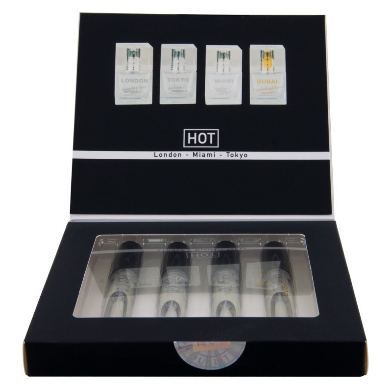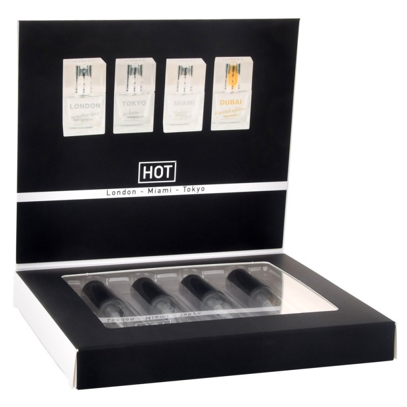 Il Pheromone Perfume Tester Box LMTD men di HOT presenta 4 fragranze urbane selezionate in un set che vi immerge nello spirito delle città di Londra, Miami, Tokyo e Dubai. Ciascuna delle fragranze è arricchita con feromoni per sottolineare e accentuare l'attrattiva maschile. Per un'aura irresistibilmente attraente!