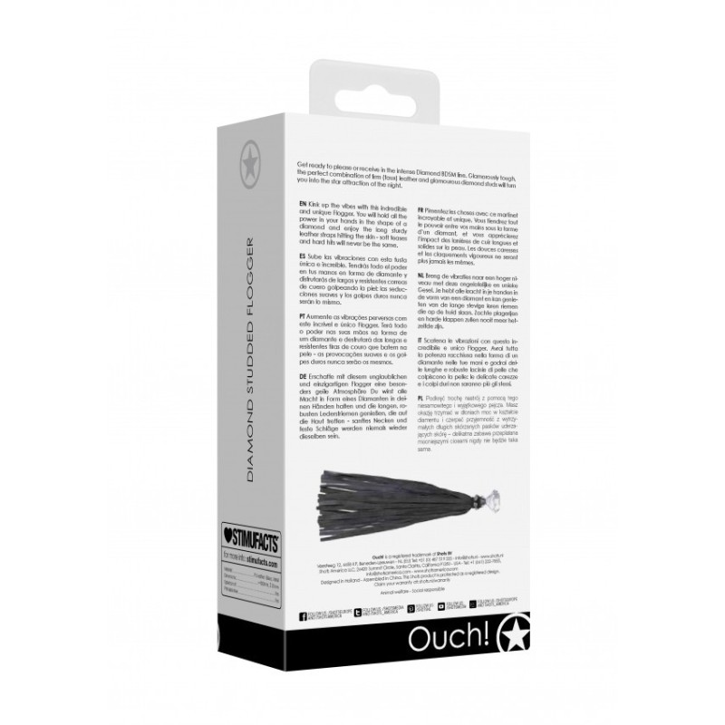 Preparati a dare piacere o riceverlo nell'intensa linea BDSM Diamond. Resistente e alla moda, la perfetta combinazione di solida (finta) pelle e borchie di diamanti eleganti ti trasformerà nell'attrazione principale della notte. Scatena le vibrazioni con questo incredibile e unico Flogger. Avrai tutta la potenza racchiusa nella forma di un diamante nelle tue mani e godrai delle lunghe e robuste lacinie di pelle che colpiscono la pelle: le delicate carezze e i colpi duri non saranno più gli stessi. L'aggiunta perfetta ad un problema molto eccitante: è ora di liberare il tuo lato oscuro.