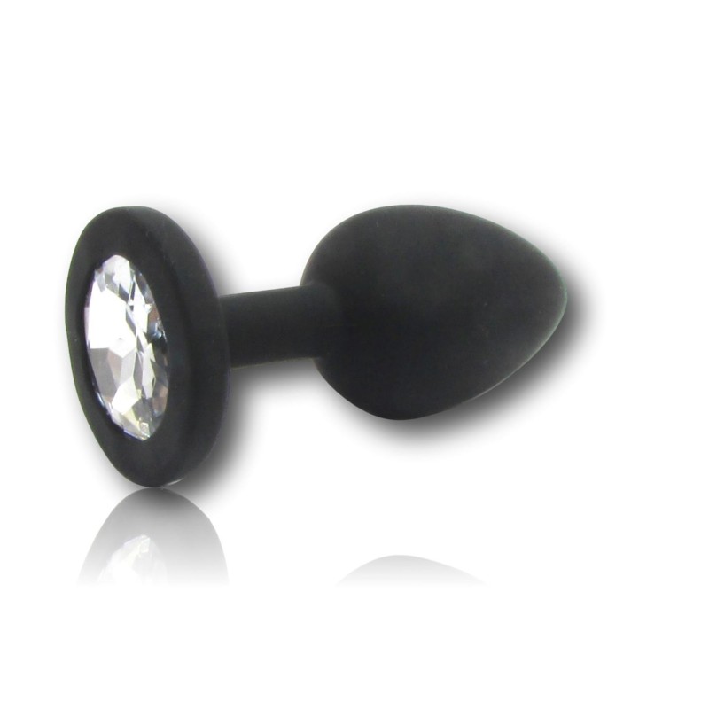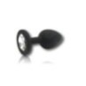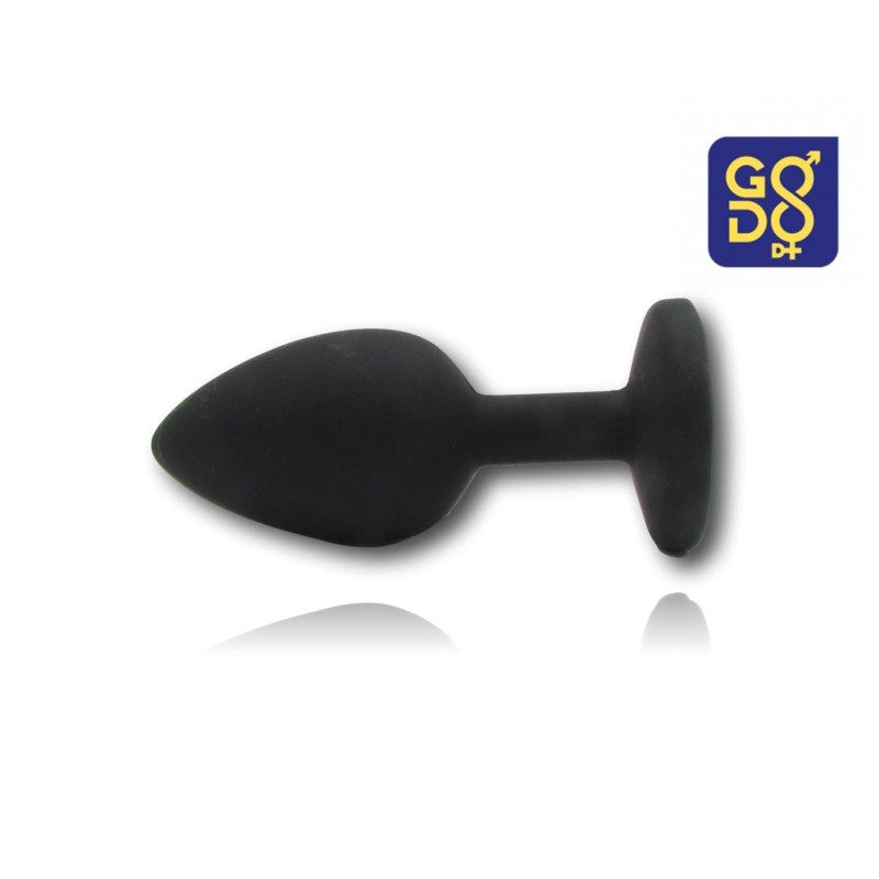 Questo plug piccolo in silicone, prodotto da Godo di più, presenta una superficie liscia con un gioiello trasparente incastonato alla base.