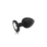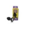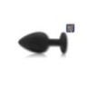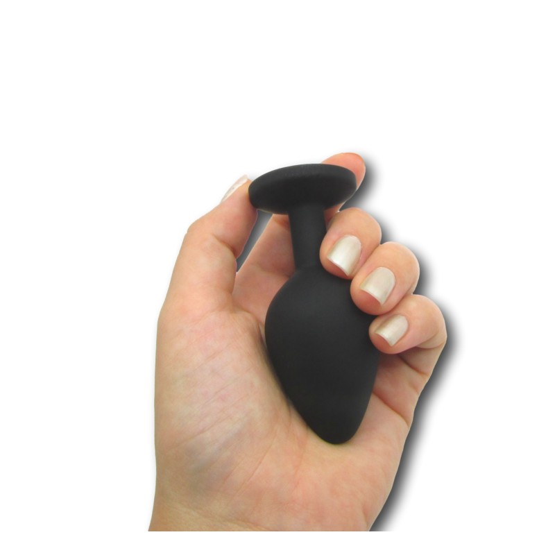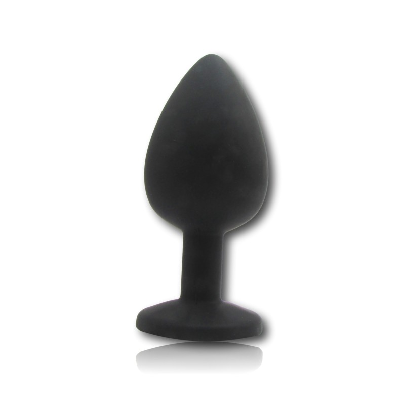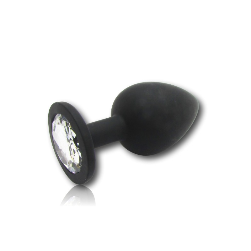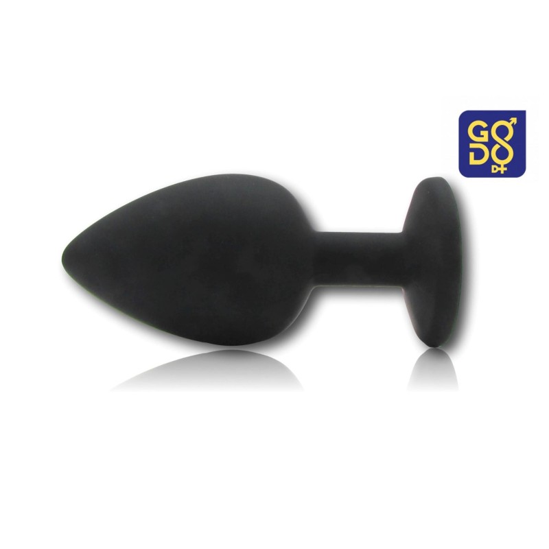 Questo plug medio in silicone, prodotto da Godo di più, presenta una superficie liscia con un gioiello trasparente incastonato alla base.