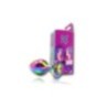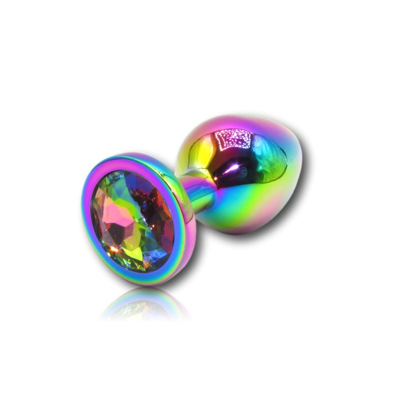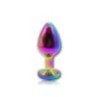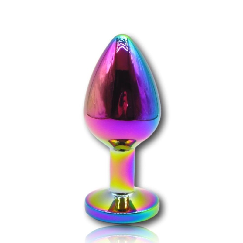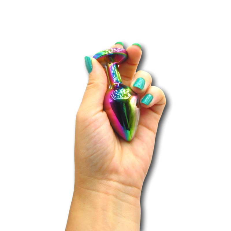 Questo plug medio in metallo colorato, prodotto da Godo di più, presenta una superficie liscia e colorata con un gioiello arcobaleno incastonato alla base.