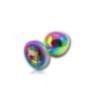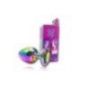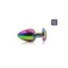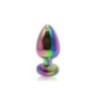 Questo plug grande in metallo colorato, prodotto da Godo di più, presenta una superficie liscia e colorata con un gioiello arcobaleno incastonato alla base.