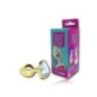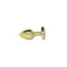 Questo mini plug dorato in alluminio del marchio Godo di + presenta una superficie liscia con un gioiello a forma di cuore trasparente, incastonato alla base. Una volta inserito nell’ano il gioiello rimarrà esterno, vestendo di scintillante eleganza, sensualità e in completa sicurezza, il vostro fondoschiena.