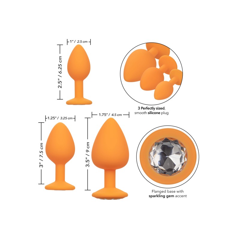 Apritevi al favoloso mondo del piacere anale con Cheeky Gems. Il kit di allenamento anale glamour comprende un set di 3 plug anali graduati con una base di gemme per permettervi di aumentare in modo sicuro e confortevole la stimolazione anale appassionata. La vista da dietro è ancora più bella grazie alla scintillante base a gemma sovradimensionata. Per godere di tutto ciò che l'esaltante mondo del gioco anale ha da offrire, è necessario un addestramento per garantire sicurezza e soddisfazione totali. Ogni sonda del nostro kit aumenta gradualmente in lunghezza e circonferenza per un piacere superbo a qualsiasi livello di gioco. Mentre ogni aumento dell'allenamento espande i vostri orizzonti, utilizzate la base ornata di gemme scintillanti per una stimolazione vaporosa, un inserimento senza sforzo e una rimozione delicata. Le sonde flessibili sono realizzate in silicone liscio e senza cuciture. Questo materiale sicuro per il corpo non è profumato e non contiene ftalati, per mantenere i vostri punti più sensibili felici e sani.
