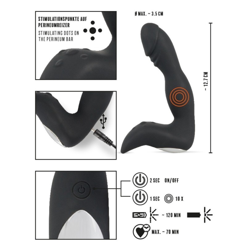 Una piccola sorpresa per la prostata! Vibratore prostatico con glande indicato e stimolatore del perineo. Stimola la prostata e il perineo allo stesso tempo con le sue 10 potenti modalità di vibrazione. La testa è particolarmente flessibile e facilita l'inserimento. La forma eccitante con la punta distintiva e le manopole stimolanti fa il resto per una stimolazione aggiuntiva.