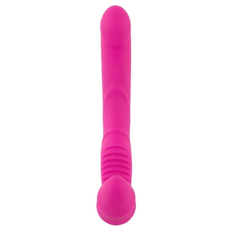 Strap-on senza spalline con doppio vibratore flessibile. Il vibratore corto e decisamente ondulato viene inserito nella vagina e tenuto in posizione dai muscoli vaginali. Così equipaggiato, il partner può essere coccolato con il vibratore più lungo, dalla texture stimolante. 9 diverse modalità di vibrazione possono essere comodamente controllate premendo un pulsante con il telecomando (portata 5 metri). Ricoperto interamente da una texture morbida al tatto, il vibratore doppio offre una sensazione molto piacevole sulla pelle quando viene indossato e coccolato. Ricaricabile - inclusi cavo di ricarica USB e batteria (CR2032) per il telecomando.