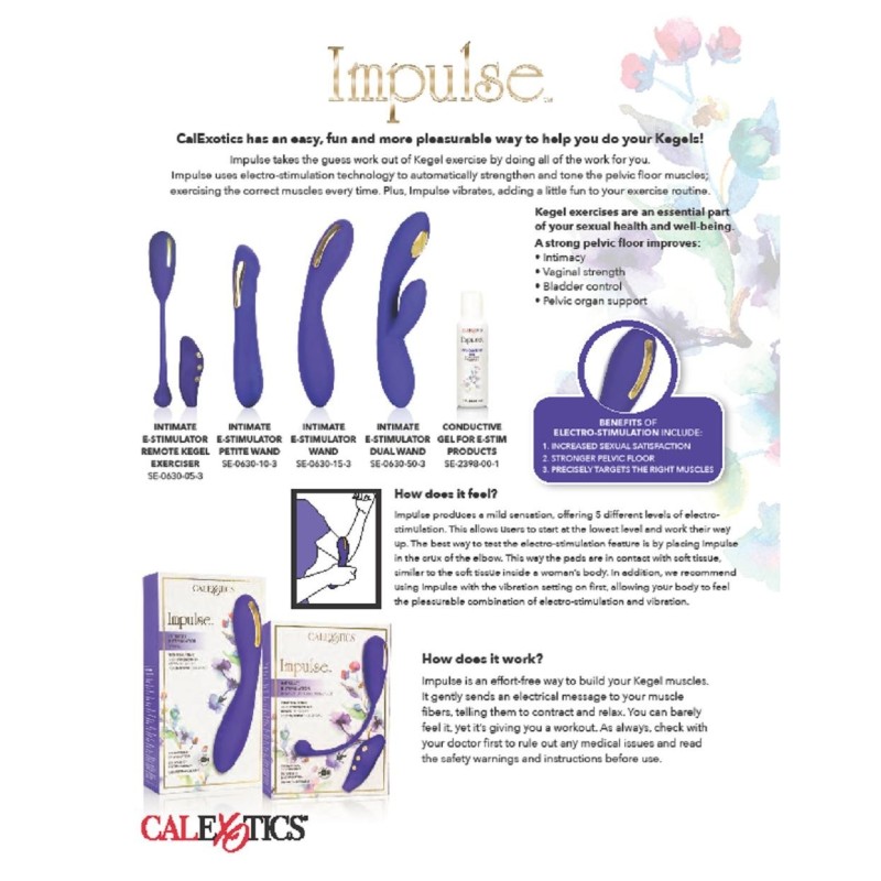 La collezione di stimolazione E di Impulse è qui per energizzare con la bacchetta Petite Intimate E-Stimulator. Questo elegante massaggiatore racchiude 5 funzioni di elettrostimolazione e 7 funzioni di vibrazione per un piacere intensamente potenziato ad ogni utilizzo. La tecnologia di elettrostimolazione utilizza impulsi elettrici per rinforzare e tonificare automaticamente i muscoli del pavimento pelvico responsabili di orgasmi intensi. I pad elettrostimetrici in lega di zinco strategicamente posizionati pulsano delicatamente per intensificare la sensazione e il climax. Abbraccia la stimolazione di tutto il corpo con le 7 funzioni di vibrazione del vibratore setoso e 5 funzioni di stimolazione elettrica controllate in modo indipendente. L'elegante pad di controllo a 3 pulsanti ti consente di godere di un controllo privo di frustrazione. Aumenta delicatamente la stimolazione e personalizza il piacere potente con 5 funzioni indipendenti di impulso elettrico. Il massaggiatore flessibile è realizzato in silicone igienicamente superiore. Questo materiale per il corpo è inodore e privo di ftalati per mantenere i tuoi punti più sensibili felici e in buona salute.