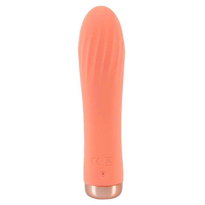 Mini vibratore scanalato pastello da Peachy! in stimolante design a scanalature con testa paffuta - entra in ogni tasca! 10 modalità di vibrazione assicurano un divertimento vario con variazioni di gioco vaginale e anale, così come la stimolazione di punti di piacere esterni e può essere comodamente controllato su e giù con il tocco di un pulsante. Il materiale in silicone di alta qualità con una consistenza morbida al tatto fornisce una sensazione di pelle molto piacevole durante il gioco e le coccole. Ricaricabile - cavo di ricarica USB incluso.