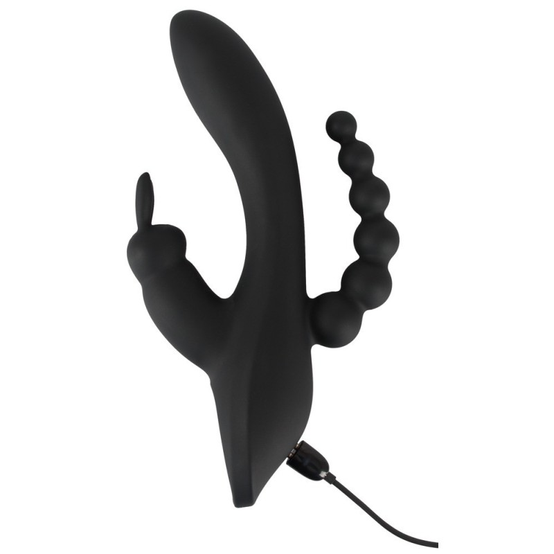 Vizia vagina, punto G, clitoride e ano allo stesso tempo! Vibratore con stimolatore clitorideo in design a coniglietto e stimolatore dell'ano in design a palla. 7 modalità di vibrazione nel fusto curvo con punta G-spot e 3 modalità di vibrazione nello stimolatore clitorideo possono essere comodamente controllate separatamente al tocco di un pulsante. Questo coccolatore a tutto tondo è coperto da una texture soft touch tutto intorno e fornisce una sensazione molto piacevole sulla pelle mentre si gioca e si coccola. Anche in ambienti umidi, perché il vibratore è impermeabile! Ricaricabile - cavo USB incluso. Lunghezza totale 20,8 cm; asta: lunghezza di inserimento 12,2 cm, Ø da 2,4 cm a 3,4 cm; stimolatore dell'ano: lunghezza di inserimento max. 10,5 cm, Ø da 0,6 cm a 2,3 cm Peso 211 g. Silicone, PU, ABS.