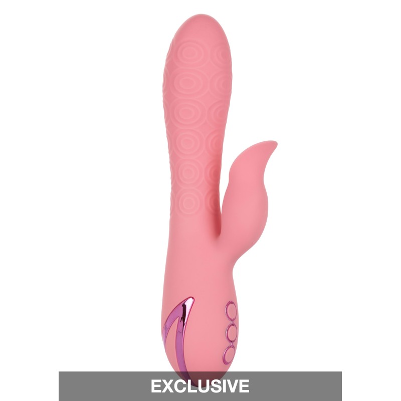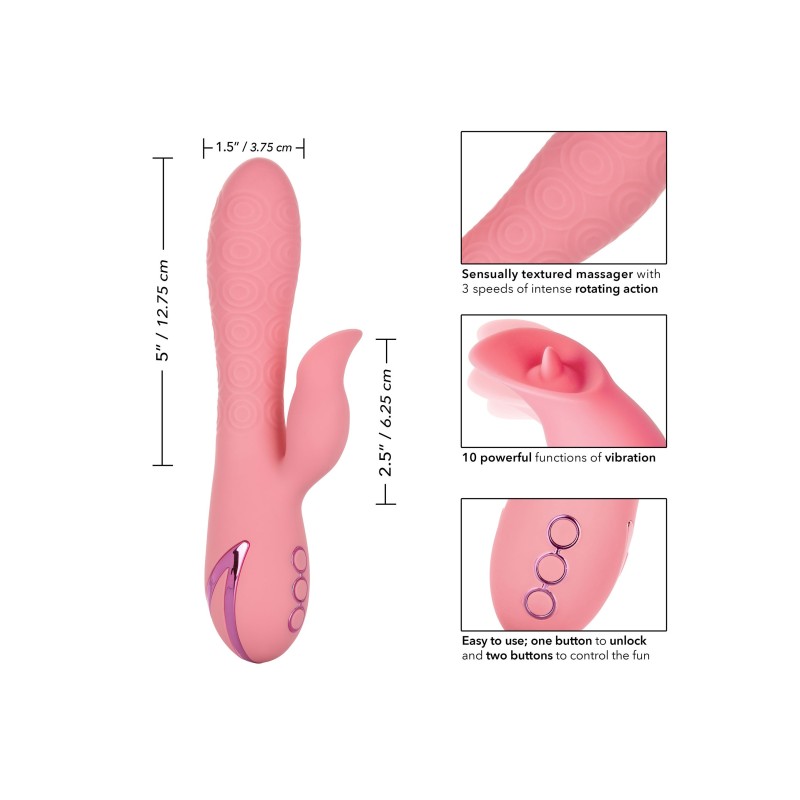 Abbandonati alla bellezza del piacere con il California Dreaming® Pasadena Player, perfettamente realizzato. Il lussuoso massaggiatore ha 10 intense funzioni di vibrazione, 3 velocità di rotazione dell'albero e un unico teaser a forma di lingua per un'esperienza di piacere unica. Il corpo in silicone senza soluzione di continuità e il teaser tremolante mettono fuori una stimolazione che scuote le ginocchia ovunque il piacere vi porti. Mentre il teaser encaser clitorideo sfarfalla e si muove con il tuo corpo, le 3 velocità di rotazione dell'albero indulgono con una potente stimolazione del punto G. Controlla e personalizza il tuo gioco di piacere con le funzioni di rotazione dell'albero a controllo indipendente e le funzioni di vibrazione teaser.Ricarica il massaggiatore in 2,5 ore con il cavo di ricarica USB fornito per godere di 45 minuti di stimolazione ad alta velocità o 2,5 ore di vibrazioni a bassa velocità. Godetevi il controllo senza frustrazioni con il pad di controllo a 3 pulsanti facile da toccare e la funzione di blocco di sicurezza per il teasing pronto per il viaggio. Il corpo praticamente senza cuciture e la porta di ricarica autosigillante ti permettono di avere questa versatile vibrazione impermeabile per un tuffo. Il silicone premium ipoallergenico è sicuro per il corpo, non profumato e senza ftalati per mantenere i tuoi punti più sensibili, felici e sani.