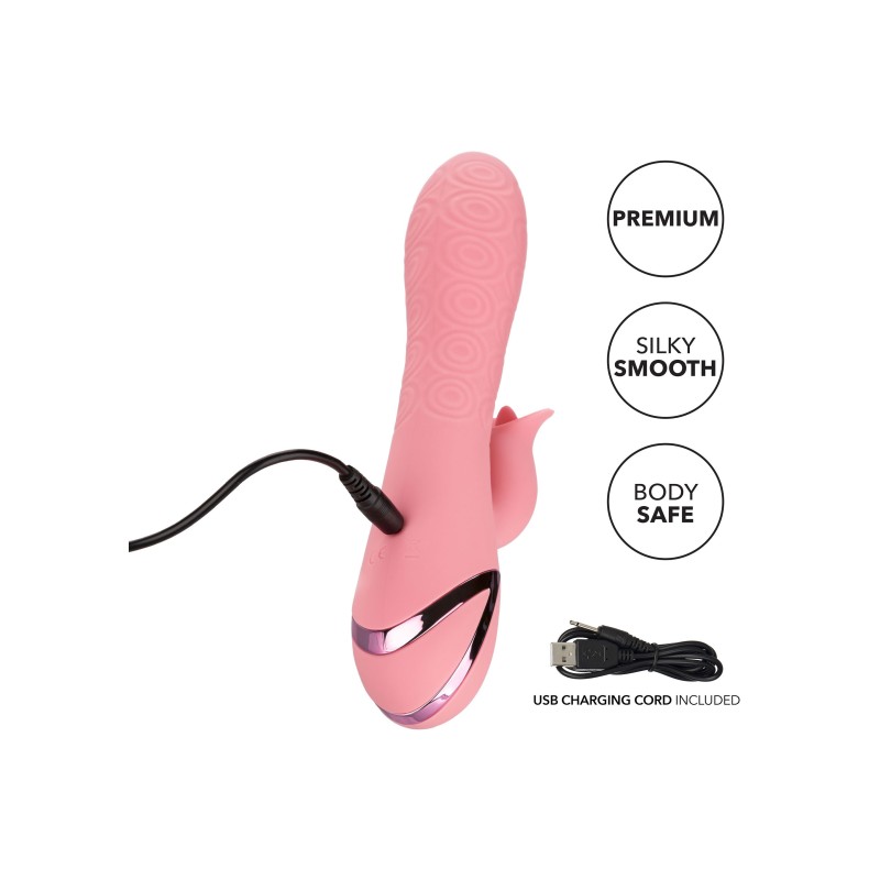 Abbandonati alla bellezza del piacere con il California Dreaming® Pasadena Player, perfettamente realizzato. Il lussuoso massaggiatore ha 10 intense funzioni di vibrazione, 3 velocità di rotazione dell'albero e un unico teaser a forma di lingua per un'esperienza di piacere unica. Il corpo in silicone senza soluzione di continuità e il teaser tremolante mettono fuori una stimolazione che scuote le ginocchia ovunque il piacere vi porti. Mentre il teaser encaser clitorideo sfarfalla e si muove con il tuo corpo, le 3 velocità di rotazione dell'albero indulgono con una potente stimolazione del punto G. Controlla e personalizza il tuo gioco di piacere con le funzioni di rotazione dell'albero a controllo indipendente e le funzioni di vibrazione teaser.Ricarica il massaggiatore in 2,5 ore con il cavo di ricarica USB fornito per godere di 45 minuti di stimolazione ad alta velocità o 2,5 ore di vibrazioni a bassa velocità. Godetevi il controllo senza frustrazioni con il pad di controllo a 3 pulsanti facile da toccare e la funzione di blocco di sicurezza per il teasing pronto per il viaggio. Il corpo praticamente senza cuciture e la porta di ricarica autosigillante ti permettono di avere questa versatile vibrazione impermeabile per un tuffo. Il silicone premium ipoallergenico è sicuro per il corpo, non profumato e senza ftalati per mantenere i tuoi punti più sensibili, felici e sani.