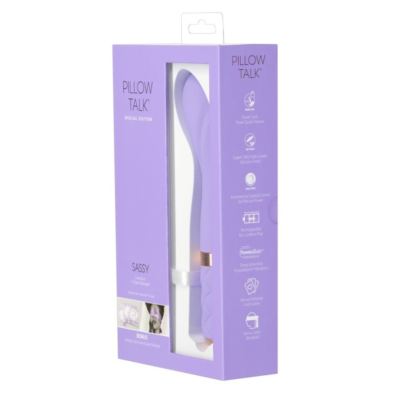 Edizione speciale: Vibrator Sassy incl. gioco di carte & sciarpa di raso! L'edizione speciale Sassy di Pillow Talk vi invita a parlare a cuscinate. Il popolare vibratore Sassy è accompagnato da un eccitante gioco di carte per le coppie con ispirazione pre-partita e un foulard di raso di alta qualità come benda o per momenti accattivanti. L'elegante vibratore coccola intensamente la vagina con scanalature di stimolazione in rilievo sul fusto e mira al punto G con la sua testa idealmente curva. Grazie alla sua superficie vellutata e morbida al tatto, scivola verso la sua destinazione intima come per magia. Il potente motore Powerbullet offre una stimolazione eccitante con vibrazioni profonde che possono essere controllate gradualmente e con precisione al tocco di un pulsante. Il pulsante di comando brilla con una preziosa pietra Swarovski®! Altri punti di forza sono la funzione "press & hold" per aumentare la potenza, la funzione "quick-off" per uno spegnimento immediato e il pratico blocco dei pulsanti. Ricaricabile - cavo di ricarica USB incluso. Vibratore: lunghezza totale 20 cm, Ø 3,8 cm. Silicone. Sciarpa di raso: 100% poliestere.