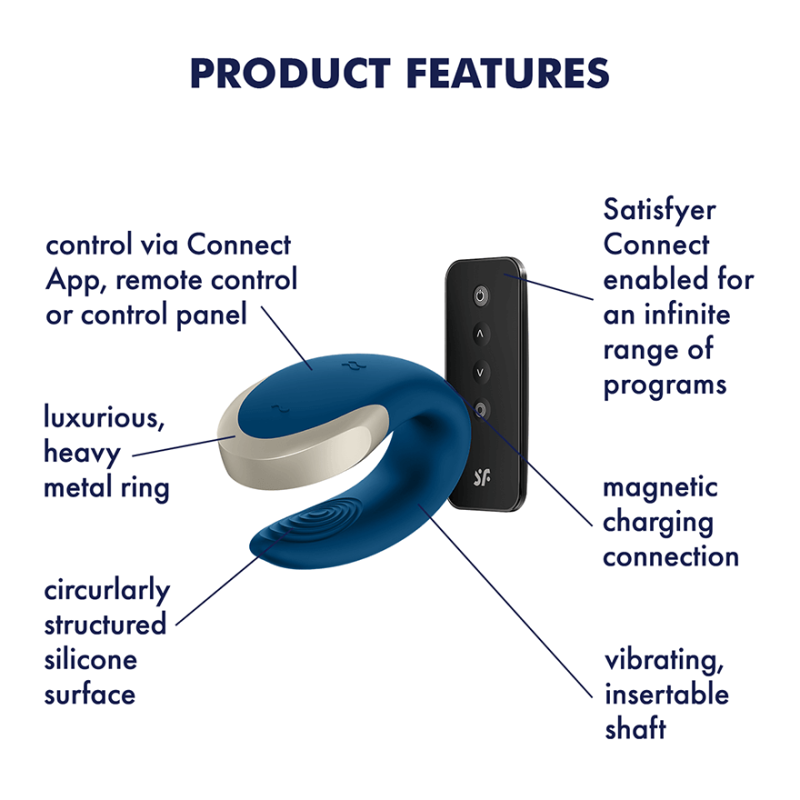 Potente e di design, Double Love Blue è il nuovo vibratore per coppie della linea Satisfyer facile da controllare attraverso telecomando wireless incluso o con la nuova app Satisfyer Connect, compatibile con qualsiasi smartphone, tablet Android o Apple e Apple Watch. È realizzato con materiali pregiati e dermocompatibili, è impermeabile, flessibile ed impreziosito da dettagli in vero metallo. La texture a coste garantisce una maggiore stabilità durante l’uso e grazie ai diversi programmi vibranti sarà facile godere sempre in modo diverso. Ricaricabile tramite cavo USB magnetico in dotazione.