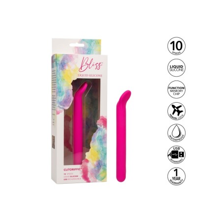 Lasciatevi trasportare nel paradiso del piacere con lo stuzzicante Bliss Liquid Silicone Clitoriffic. Questo sensazionale vibratore è dotato di una punta flessibile e piatta, di un design in silicone liquido che forma il corpo e di 10 potenti funzioni di vibrazione. La punta morbida e a massimo contatto e il corpo in silicone liquido al 100% sono perfetti per accarezzare i punti dolci interni ed esterni. Giocate con ogni aumento delle 10 velocità di vibrazione incrementali con il pulsante di controllo easy-touch. Il pulsante in silicone easy-touch permette di controllare il piacere puro e di tenerlo premuto per 3 secondi per accenderlo o spegnerlo. Il silicone liquido ultra morbido è ideale per esplorare con facilità i punti più intimi e sensuali del piacere. Utilizzate il controllo a pulsante singolo per godere fino a 110 minuti di piacere vibrante. Ricaricate la vostra passione in sole 1,5 ore collegando il cavo USB in dotazione alla porta di ricarica autosigillante sulla base del massaggiatore.