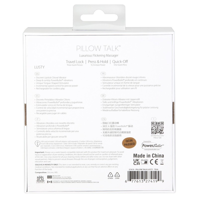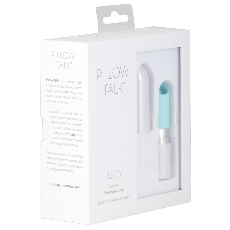 Design discreto per il rossetto da borsetta! Mini vibratore Lusty di Pillow Talk, che sembra un vero e proprio rossetto con il suo design nobile e il gioiello Swarovski - con o senza cappuccio protettivo. Una lingua tremolante vibra nella sua punta aperta, perfetta per la stimolazione mirata dei punti di piacere, ad esempio su clitoride, capezzoli, testicoli, perineo, ecc. Le vibrazioni lambenti possono essere comodamente controllate in modo graduale con la semplice pressione di un pulsante. Ricaricabile - Cavo di ricarica USB incluso Lunghezza totale 9,4 cm, larghezza 2,4 cm. Peso 38,5 g. ABS, silicone.