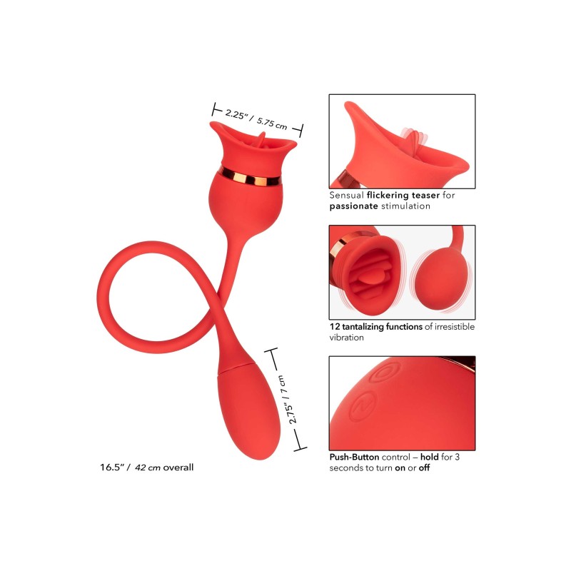 Oh Casanova! Il sensuale French Kiss Casanova è un irresistibile stuzzicatore tremolante con un potente bullet vibrante per un gioco davvero appassionato. Questo potente vibratore vi mostrerà la vera estasi ad ogni sfarfallio del teaser a lingua, con doppio motore vibrante e 12 funzioni di vibrazione. Mentre il teaser tremolante fa la sua magia, il potente bullet si flette e si muove con il vostro corpo per offrire vibrazioni da far tremare le ginocchia. Il teaser e il bullet possono essere usati indipendentemente o contemporaneamente per una stimolazione mozzafiato. Il teaser a contatto pieno e la lingua svolazzante sono stati realizzati per adattarsi perfettamente ai vostri punti di piacere più intimi. Il silicone morbido ed elastico e il corpo sensualmente sagomato consentono di offrire un piacere puro e mirato da qualsiasi angolazione. Usate il pulsante easy-touch per controllare fino a 70 minuti di piacere vibrante a bassa velocità e 50 minuti ad alta velocità. Ricaricate il vostro piacere in soli 100 minuti con il cavo USB in dotazione nella porta di ricarica auto-riparante del massaggiatore. Le dimensioni discrete del mini massaggiatore e il pulsante di blocco da viaggio lo rendono il compagno di viaggio perfetto, che vi permetterà di abbracciare il piacere irradiato ovunque vi portino le vostre fantasie.